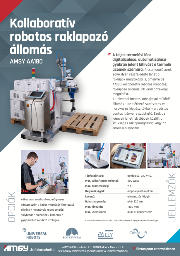 A robotika meghatározó fejlődési területe a mai világnak és nagy szerepet játszik az ipari folyamatok új szintre emelésében. Több mint 25 éves működésünk során számos helyen végezzük gyűjtőcsomagok és raklapok adatcímkézését, most megoldást kínálunk a raklapok automatikus összerakására is. Kollaboratív robot partnerünk a Universal Robots. Velük együttműködve kínáljuk jelenlegi és jövendőbeli ügyfeleinknek a robotokat integráló csomagolási, címkézési és raklapozási megoldásokat.